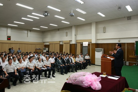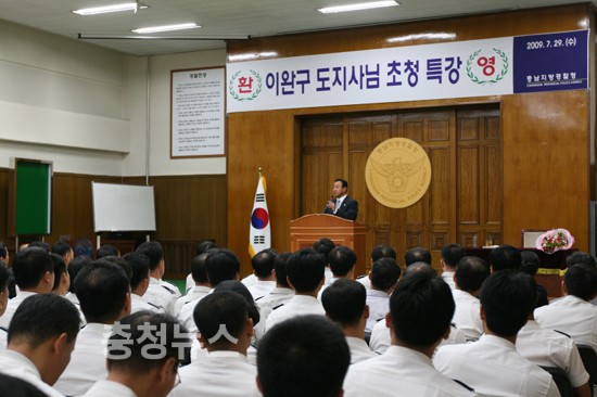 이완구 충남도지사가 친정인 충남지방경찰청을 찾아 경찰 퇴임 15년만에 처음으로 충남경찰 가족을 대상으로 특강을 가졌다. 충남지방경찰청(청장 박종준)은 29일 오전 3층 대회의실에서 박종준 청장 등 직원 200여명이 참석한 가운데 이완구 충남도지사를 강사로 초청,'경찰관으로서 긍지와 자부심'이라는 주제로 특강을 했다.