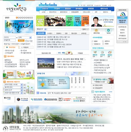 대덕구 홈페이지(www.daedeok.go.kr)가 누구나 쉽게 접근하고 이용할 수 있도록 새롭게 단장했다. 대전시 대덕구(구청장 정용기)는 31일 구청 중회의실에서 구 홈페이지 웹 접근성 강화 및 행정포털시스템 구축사업 완료에 따른 보고회를 갖는다.