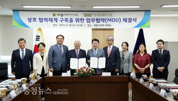 이날 MOU 체결식에는 서금택 의장을 비롯, 세종시의원 3명(안찬영, 이영세, 차성호)과 한국법제연구원 3명(이익현, 최환용, 김윤정) 등이 참석했다.