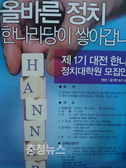 한나라당 대전시당은(위원장 송병대) 11일(내일) 오후6시 30분, 시당 3층 강당에서 ‘제1기 대전 한나라정치대학원’과정의 개원식을 갖고 11주간의 강의에 들어 갈 예정이다.
