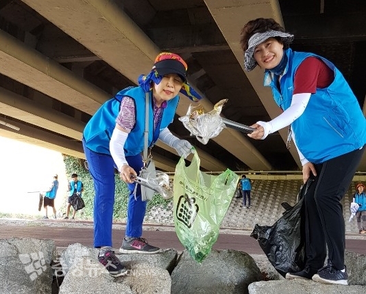 도정자 회장(우)과 환경지킴이 하천쓰레기 수거작업