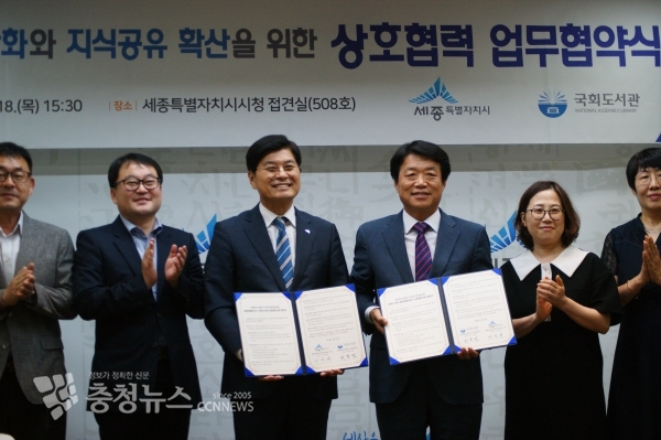세종시(시장 이춘희)은 18일 국회도서관과 정책역량 강화와 지식정보 공유 확산을 위한 상호협력 업무협약을 체결했다.