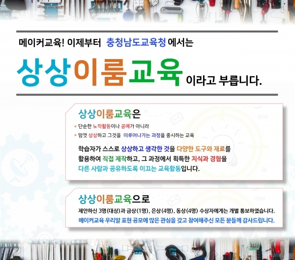 충남교육청(교육감 김지철)은 지난 6월 한 달간 메이커교육의 우리말 표현을 공모한 결과 ‘상상이룸교육’이 채택됐다고 23일 밝혔다.