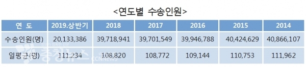 대전도시철도의 올해 상반기 수송실적을 분석한 결과 대전시의 인구가 2017년도 1,502천명, 2018년도 1,487천명, 2019년 6월 1,483천명으로 감소하고 있음에도 불구하고 수송인원은 2019년 6월 기준 111천명으로 전년대비 2.2% 증가한 일일 2,400명이 늘었다.