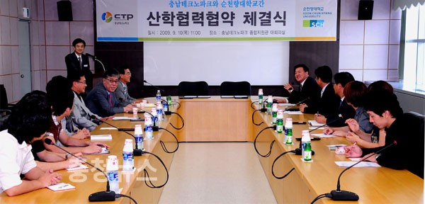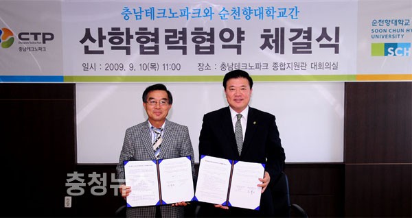 충남테크노파크와 순천향대가 지역 중소기업의 경쟁력 강화를 위해 글로벌 무역전문가 양성에 나선다. 충남테크노파크는 10일 종합지원관 2층 대강당에서 순천향대 글로벌 무역전문가 양성사업단과 무역전문가 양성을 위한 상호 협력을 체결했다.
