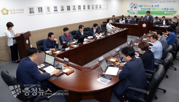 당진시의회(의장 김기재)는 8월 중 의원출무일을 의회 대회의실에서 김기재 의장을 비롯한 시의원들과 당진시청 관계 공무원 등 30여 명이 참석한 가운데 23일 개최 했다.