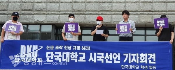 단국대 비상대책위원회는 23일 단국대 천안캠퍼스에서 단국대학교 의과학연구소에서 인턴 2주 경력으로 논문 제1저자로 등재된 조국(54) 법무장관 후보자 딸 조(28)모씨와 장(소아청소년과) 교수 관련 '시국선언 기자회견'을 열었다.