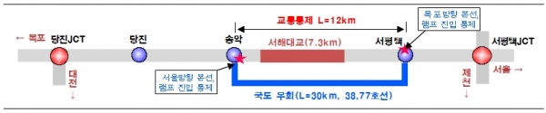 서해대교가 통제될 경우 근거리(송악, 서평택)는 국도 38호선, 원거리(수도권, 전북)는 서천공주, 천안논산, 경부선 등으로 우회해야한다.
