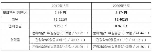모집분야 중 ‘문화예술학부(실용음악)-보컬’ 전형이 44.44:1로 가장 높은 경쟁률을 보였으며 ‘관광학부(항공서비스)’가 34.93:1, ‘문화예술학부(실용음악)-제작’이 24.86:1로 그 뒤를 이었다.