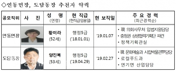 주민 면접 및 심사결과에 따라 연동면은 황미라 사무관, 도담동은 양진복 사무관이 최고 득점을 획득해 추천을 받았으며, 추천 결과는 곧바로 인사부서로 통보됐으며 16일자로 인사발령 됐다.
