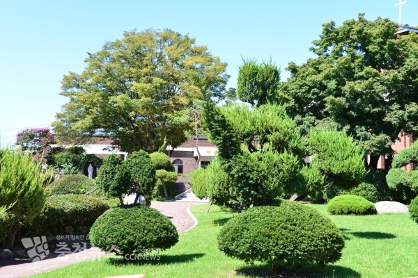 팸투어 일행은 '부강역'을 출발해서 4분후 '부강성당 정류장’에서 하차한후 도보로 5분을 이동하여 1957년 건립한 '부강성당'은 정원이 아름답다고 소문난 성당에 도착했다.