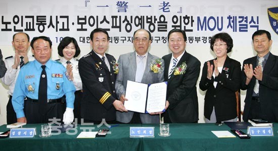 대전 동구(구청장 이장우)는 6일 동구 운전자 푸른쉼터에서 김홍균 대한노인회 동구지회장, 이장우 동구청장, 정기룡 동부경찰서장 등이 참석한 가운데 노인 교통사고 예방활동 지원을 위한 업무협약을 체결했다.