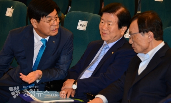 이춘희 세종시장(좌)은 20일 국회도서관 대강당에서 열리는 '국회세종의사당 설치를 위한 심포지엄'에 참석 이해찬 더불어민주당 국회세종의사당추진특별위원장, 박병석 부위원장(중앙)과 협의를 하고 있다.