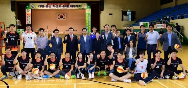 지난 21일, 충남 홍성군 홍주문화체육센터에서 대전~충남권의 혁신도시 지정을 염원하는 민관 합동배구대회가 개최됐다.