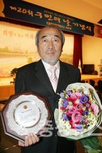 ※사진설명 : 자치구 승격 20주년을 맞아 지난 10일 서구청 2층 대강당에서 가진 서구민의 날 행사에서 자랑스런 서구인상을 받은 연극인 이종국씨와 유복미 복수동 새마을부녀회장 그리고 대전충남 생태보전시민모임