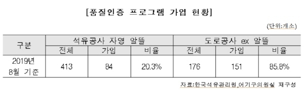 반면, 도로공사가 운영하는 ‘ex 알뜰주유소’의 경우 전체 176곳 중 151곳이 품질인증 프로그램에 가입해 85.8%의 주유소가 품질관리를 하고 있다.