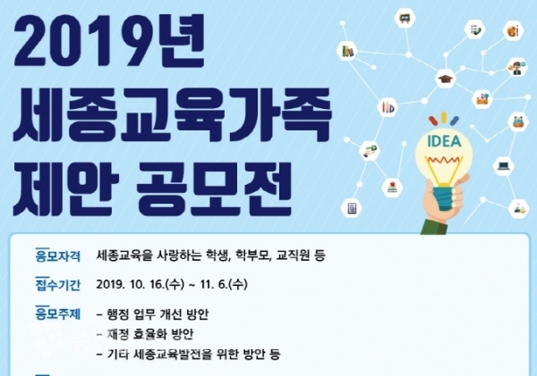 세종특별자치시교육청(교육감 최교진)은 세종교육에 대한 세종 시민들의 인식을 제고하고 제안제도 참여 활성화를 위해 ‘2019년 세종교육가족 제안 공모전’을 다음 달 6일까지 진행한다.