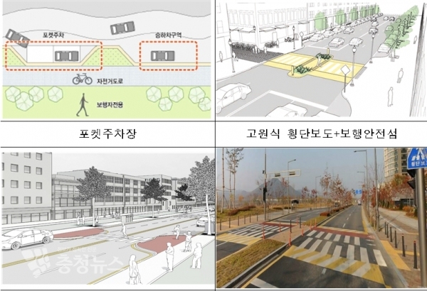보행자가 안전하게 도로를 건널 수 있도록 횡단보도에는 중앙교통섬과 보행자 횡단거리를 줄이는 차로폭 좁힘(내민연석) 등을 적극 도입할 계획이다.
