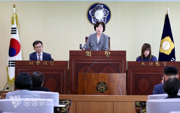 시정질의 하는 김영애 아산시의회 의장 / 충청뉴스 최형순 기자