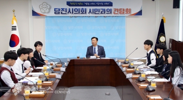 당진시의회 김기재의장은 25일 시의회 대회의실에서 당진청소년 평화나비(회장 김나민, 당진고3) 임원 및 시의회 관계공무원 등 총20여 명이 참석한 가운데 간담회를 가졌다.