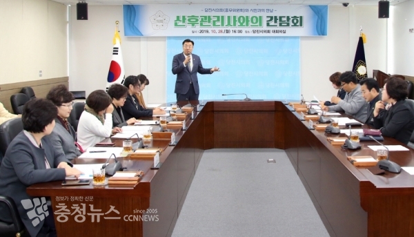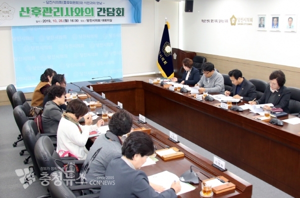 당진시의회(의장 김기재)는 28일 시의회 대회의실에서 김기재 의장을 비롯한 시의원 5명과 산후관리사 6명 관계공무원 등 총 20여 명이 참석한 가운데 산후관리사와의 간담회를 가졌다.