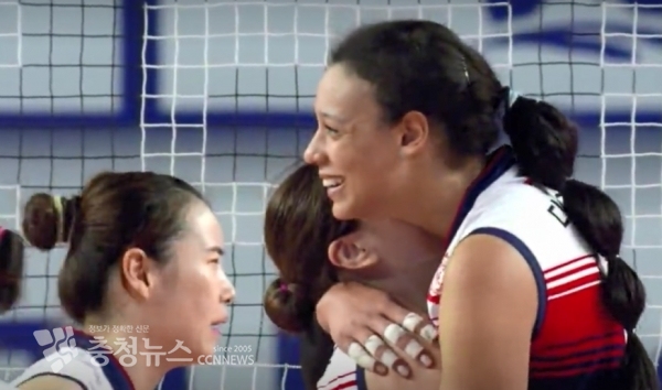 디우프가 인삼공사 승리에 동료들과 기뻐 하고 있다. / 충청뉴스 최형순 기자