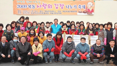 이번 행사는 목동 자생단체협의회(위원장 이정수) 주관으로 성지교회, 충남여고 샤프론봉사단, 포스코 목동건설현장사무소 직원 등의 후원으로 마련됐으며 김장김치 500포기를 정성껏 담아 어려운 이웃과 결연세대 등 100세대를 직접 방문 전달했다.