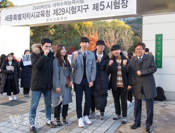2020학년도 대학수학능력시험이 치러진 14일 오전 세종시 양지고 앞에서 최교진 세종시교육감이 수험생들과 함께 화이팅을 외치고 있다.