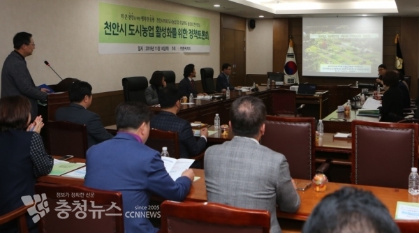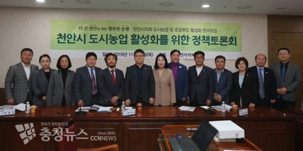 천안시의회(의장 인치견) ‘도시농업 및 로컬푸드 활성화 연구모임 (대표의원 이종담 의원, 김선태 의원, 김월영 의원, 육종영 의원)’은 14일 천안시의회 경제산업위원회 회의실에서 ‘천안시 도시농업 활성화를 위한 정책토론회’를 개최했다.