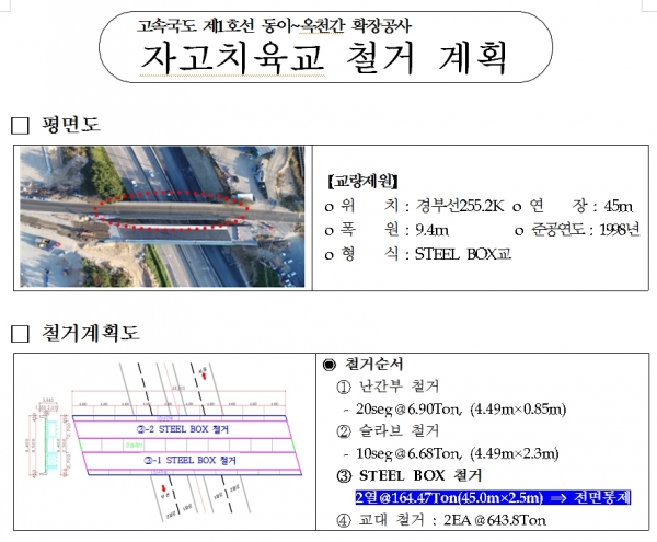 한국도로공사 아산천안건설사업단은 고속국도 제1호선 동이~옥천간 확장공사 구간내 옥천휴게소 부근 자고치육교(부산기점 255.2KM) 철거 작업과 관련하여 19일에 해당 구간 고속도로 본선(양방향) 주행차로와 추월차로의 교통소통을 일시적으로 전면 제한할 예정이다.