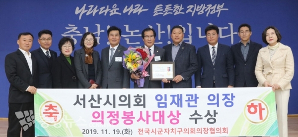 서산시의회 임재관 의장이 19일 논산시의회에서 개최된 제223차 전국시도대표회의에서 지방의정봉사대상을 수상했다.
