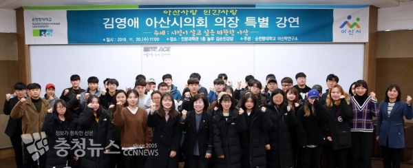 아산시의회 김영애 의장은 지난 20일 순천향대학교 인문과학관 강당에서 학생들을 대상으로 ‘시민이 살고 싶은 따뜻한 아산’을 주제로 ‘아산학’ 특강을 실시했다.