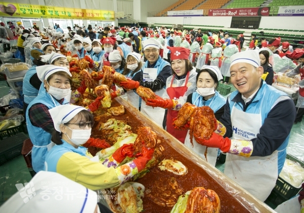 현대제철은 21일 신성대학 실내체육관에서 ‘2019 행복나눔 김장나누기’행사를 가졌다. 지역방송사와 공동으로 진행한 이번 행사에는 현대제철 임직원과 김홍장 시장, 어기구 국회의원, 김기재 시의회의장이 참여했다. 또 인근 주민들과 대한적십자, 녹색어머니회, 여성복지회, 새마을부녀회, 자매결연복지시설 관계자 등 400여 명이 동참해 시민 한마당이 됐다.