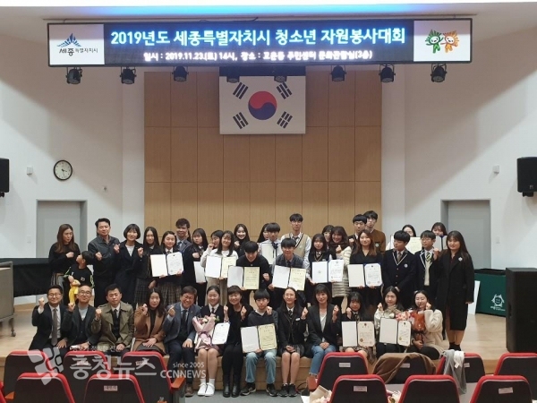 세종특별자치시청소년활동진흥센터(센터장 조주환)는 23일 고운동복합커뮤니티센터에서 지역 청소년 및 지도자 200여명이 참여한 가운데 2019년도 세종특별자치시 청소년자원봉사대회 시상식을 개최했다.