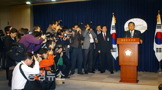< 단독> 이완구 충남지사가 3일 오후 국회 정론관에서 정부의 세종시 수정 방침에 따른 책임을 지고 지사직을 전격 사퇴했다.