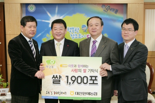 대전원예농협 김의영 조합장은 직원들과 함께 11일 오전 대전시청 응접실에서 박성효 대전시장을 방문하고 추운 겨울 어려운 가정을 위해 전달해 달라며 백미 4kg 1,900포 (2천만원 상당)을 기탁했다.