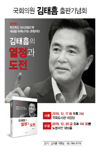 자유한국당 김태흠 국회의원(보령서천)이 출판기념회 개최를 예고하면서 3선 도전을 향한 담금질에 나선다.