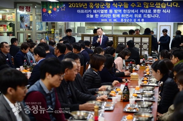 김석환 홍성군수는 6일 홍성군청 구내식당에서 본청직원 및 읍·면장 등 400여 명의 직원들에게 국밥과 떡, 과일 등 따뜻한 한 끼 식사를 제공하며 한 해 동안 군정 발전을 위해 노력한 직원들을 위로하는 시간을 가졌다.