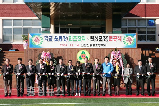 이날 완공된 신탄진 용정초교 인조잔디운동장 조성 사업은 지난 6월부터 국비 3억 5천만 원, 시비 7천 5백만원, 구비 7천 5백만 원 등 총 총예산 5억 원이 투입된 사업으로 축구장, 육상트랙, 족구·배구 경기장으로 활용될 수 있는 다목적구장으로 조성됐다.
