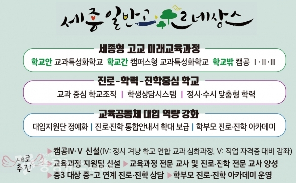 (학교 안) 세종의 모든 일반고를 교과특성화학교로 지정하고, (학교 간) 학교별 장점을 연합해 동반성장의 기회를 넓히는 한편,(학교 밖) 캠퍼스형공동교육과정의 영역도 확대 운영할 계획이다.