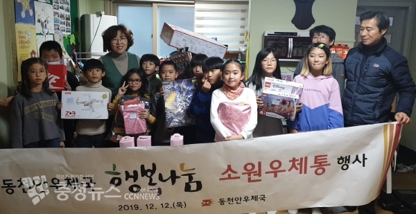 진수동 동천안우체국장은 “소원물품을 받은 아이들이 행복하고 즐거운 연말을 보내길 바라며 앞으로도 이와 같은 봉사활동을 꾸준히 전개하여 우체국의 사회적 책임 이행을 다할 수 있도록 최선을 다하겠다.”고 말했다.