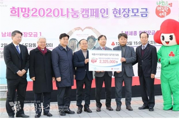 세종특별자치시시설관리공단(이사장 직무대행 정인태)은 13일 조치원광장에서 개최한 사회복지공동모금회 주관 ‘희망 2020나눔 캠페인’ 북세종 현장모금 행사에서 임직원들이 자발적으로 모금한 성금을 전달했다.
