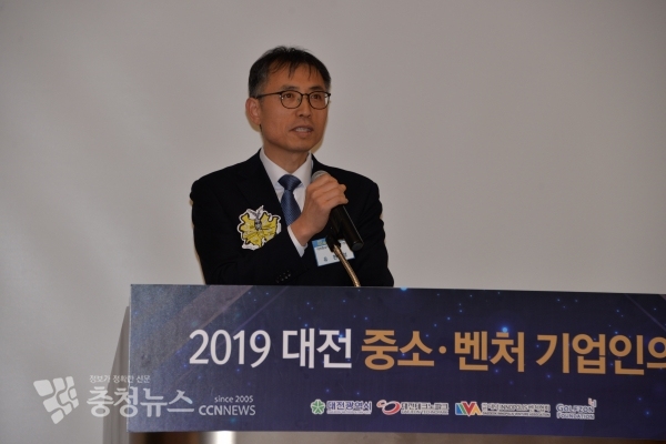 유환철 대전충남지방중소벤처기업청장은 18일 대전 라마다호텔 2층 로얄볼룸에서 열린 ‘2019년 대전중소기업인의날 행사’에서축사를 하고 있다.