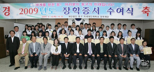 동구 차세대인재육성 장학재단은 지역의 우수인재를 육성하기 위해 작년 8월 설립, 어려운 경제여건 속에서도 지역사회의 성원에 힘입어 11월 말 현재 14억 7천여만 원의 기금을 마련하는 성과를 거뒀다. 이와 함께 지난 9월 ‘2009년 장학증서 수여식’을 개최, 재단 설립이후 처음으로 장학생 45명을 선발해 총 5천만원의 장학금을 전달했다.