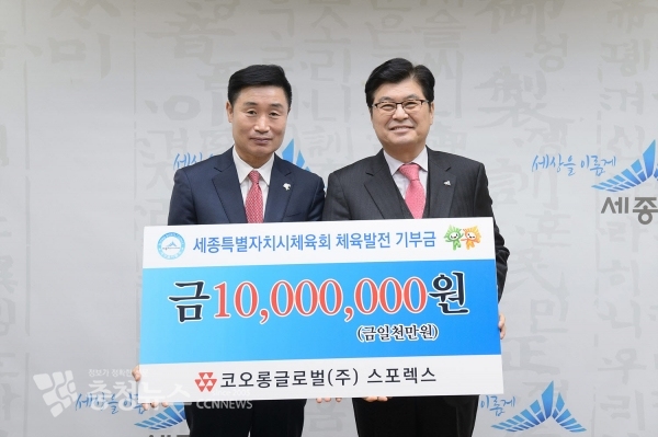 기부금은 27일 세종시청에서 송승회 코오롱글로벌(주) 스포렉스 본부장으로부터 이춘희 세종특별자치시 체육회장에게 전달되었다.