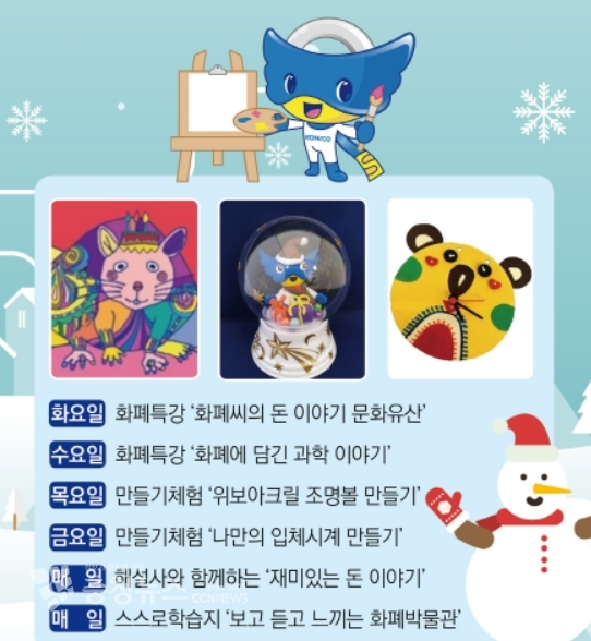 만들기 및 화폐특강 프로그램은 화폐박물관 홈페이지를 통해 신청 가능하다. 화폐박물관 이강원 차장은 “겨울방학을 맞는 어린이들이 특별한 체험 프로그램을 통해 재미있고 유익한 시간을 보낼 수 있을 것”이라고 말했다.