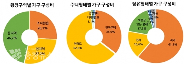 우선 표본가구로 선정된 세종시민의 46.7%가 동(洞) 지역에 거주했으며, 주택형태별로는 62.8%가 아파트에 살고 있고, 점유형태별로는 자가가 61.3%로 가장 높게 나타났다.