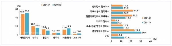세종시내 의료기관 이용률은 57.9%이고, 시외 의료기관 이유로는 ‘종합병원이 없어서’가 33.2%로 가장 높았다. 시민건강증진 방안으로 ‘체육시설 확충 및 운동환경 조성’을 가장 선호하는 것으로 조사됐다.