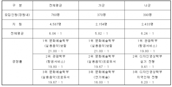 모집분야 중 문화예술학부(실용음악)보컬 실기전형이 7명 모집에 147명이 지원해 21.00:1로 가장 높은 경쟁률을 보였으며 관광학부(항공서비스) 19.80:1, 문화예술학부(실용음악)프로듀서 19.67:1 등이 그 뒤를 이었다.