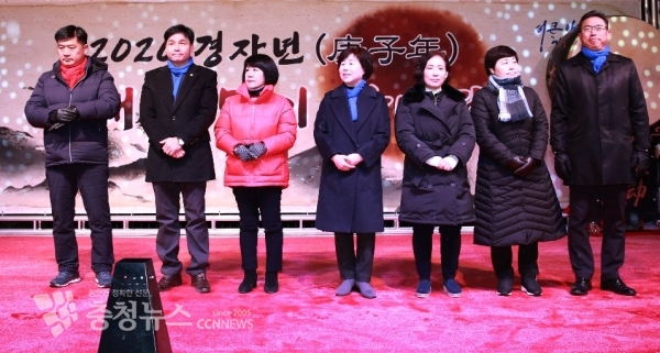 아산시의회 의원들이 2020년 경자년(庚子年) 해맞이 행사를 맞아 아산시민의 행복지수 높이기 위해 최선 다해 의정활동 펼쳐 나갈 것 약속하며 시민들께 큰절을 올리고 있다.(좌로부터 맹의석·황재만·이의상의원, 김영애 의장, 조미경·김수영·홍성표의원)